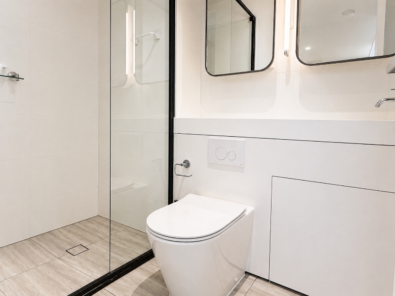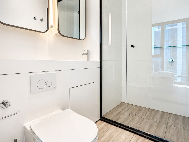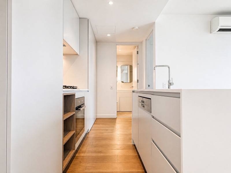 Upstairs is dedicated to the primary living space. The open-plan kitchen, dining, and living area is positioned to maximise natural light and outlook, flowing directly onto a front-facing balcony with sea views. A second rear balcony provides additional outdoor space and cross-ventilation.