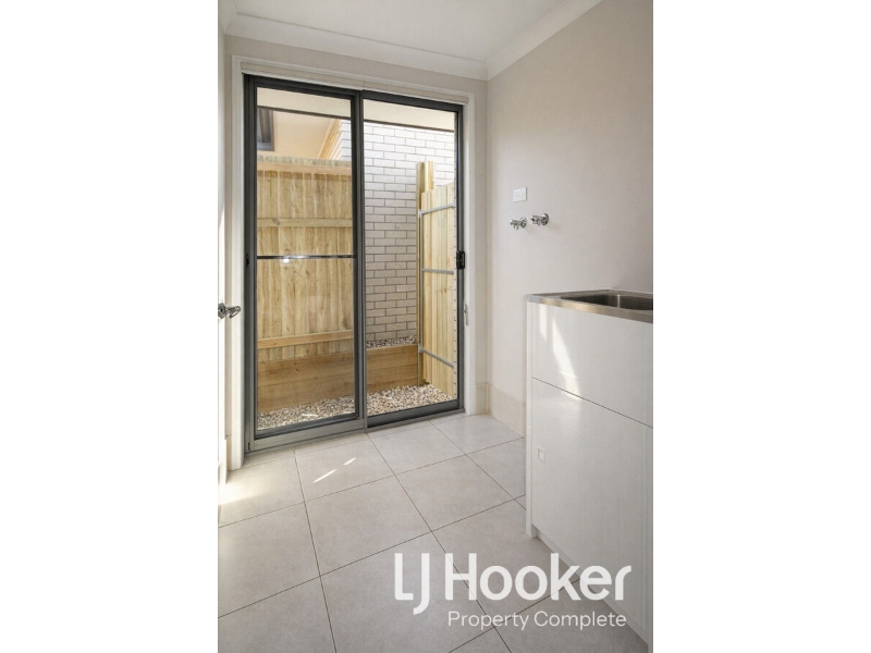 The open-plan living space flows directly to a covered alfresco area, ideal for entertaining or enjoying a quiet moment outdoors. The fully fenced backyard provides a secure and private space with lawned areas, making it perfect for relaxed outdoor living.